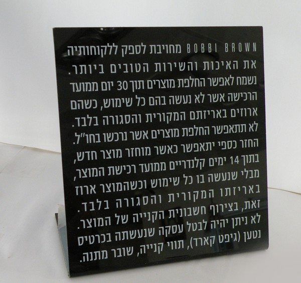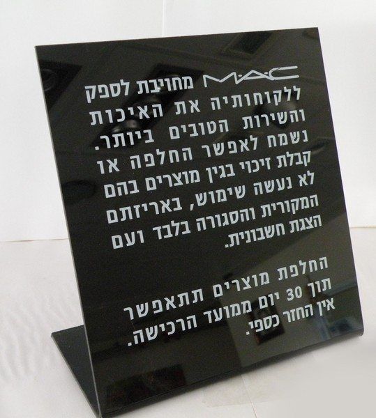 • הדפסה אחורית: אנו מדפיסים בגב השלט, מה שמגן על ההדפסה מפני שריטות ומעניק אפקט של עומק וברק דרך החומר השקוף.